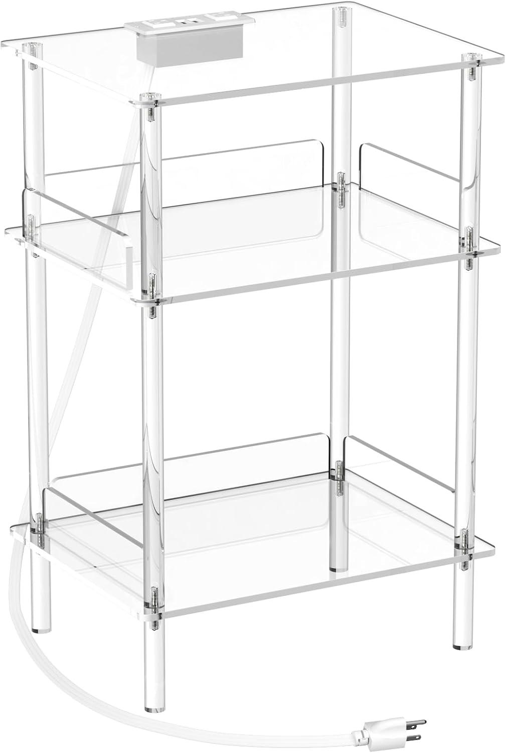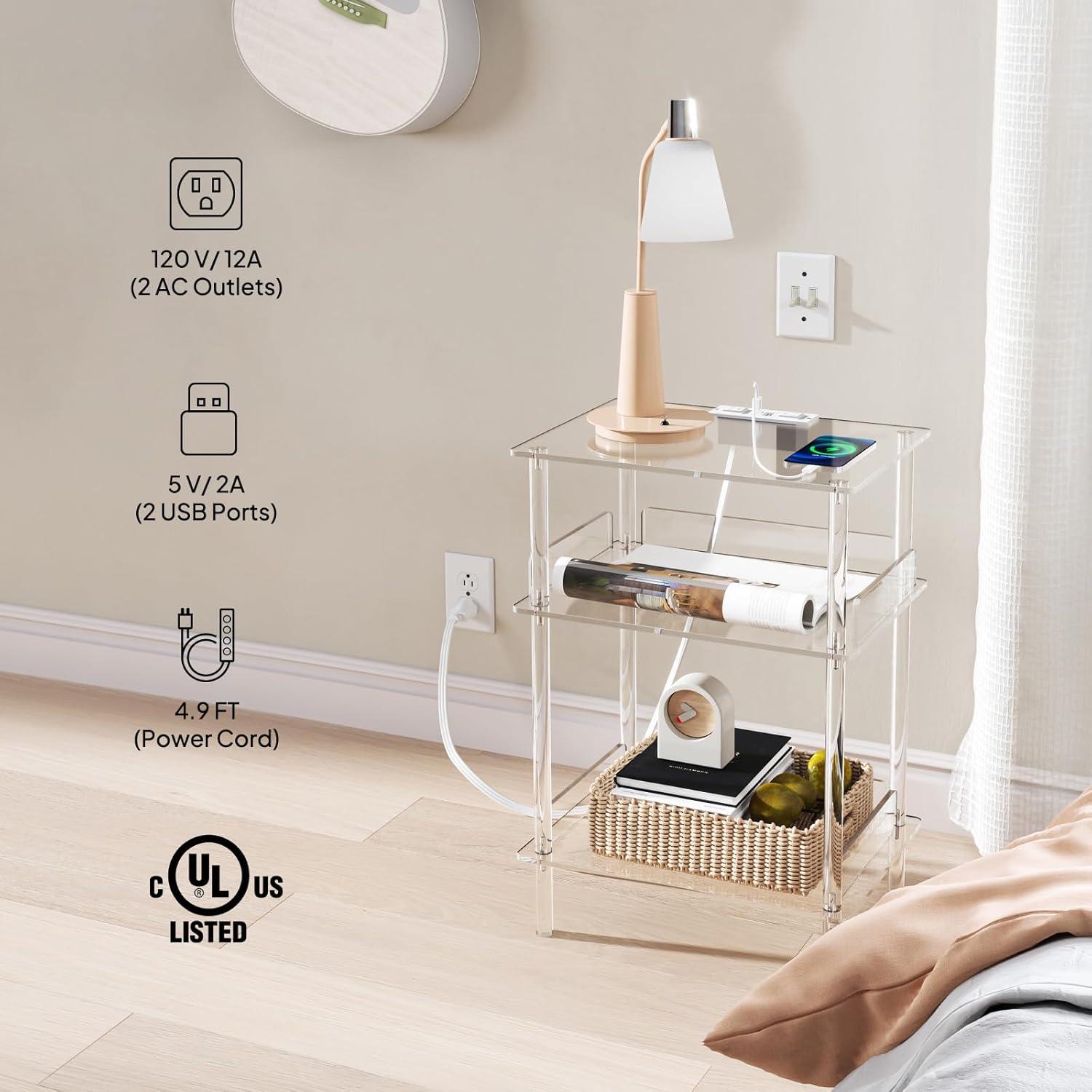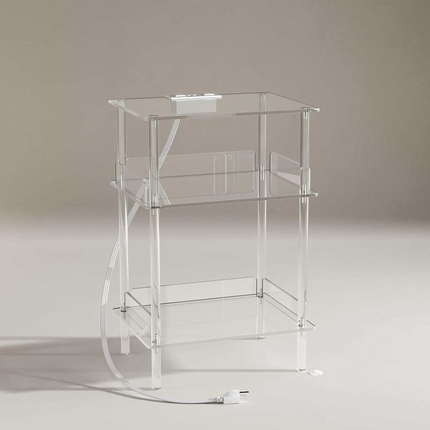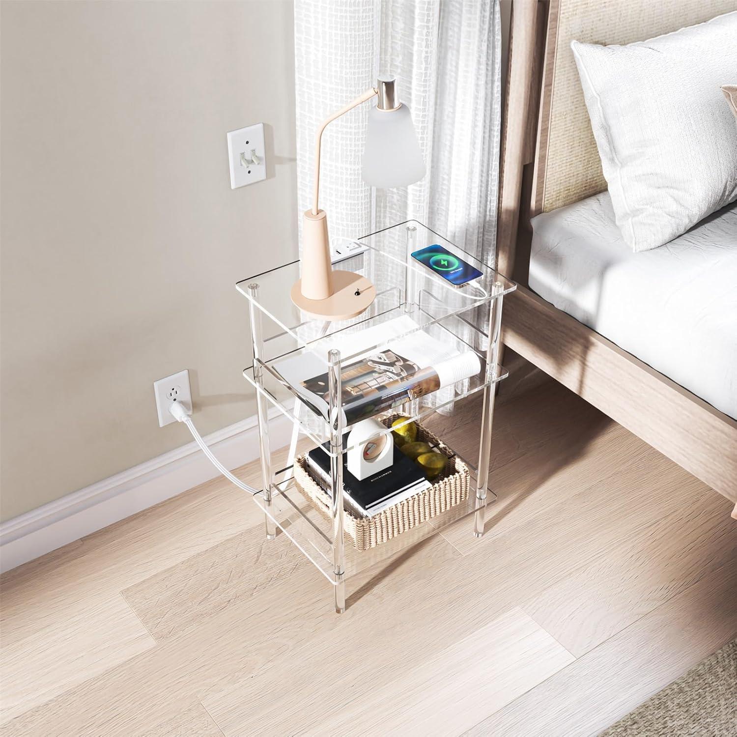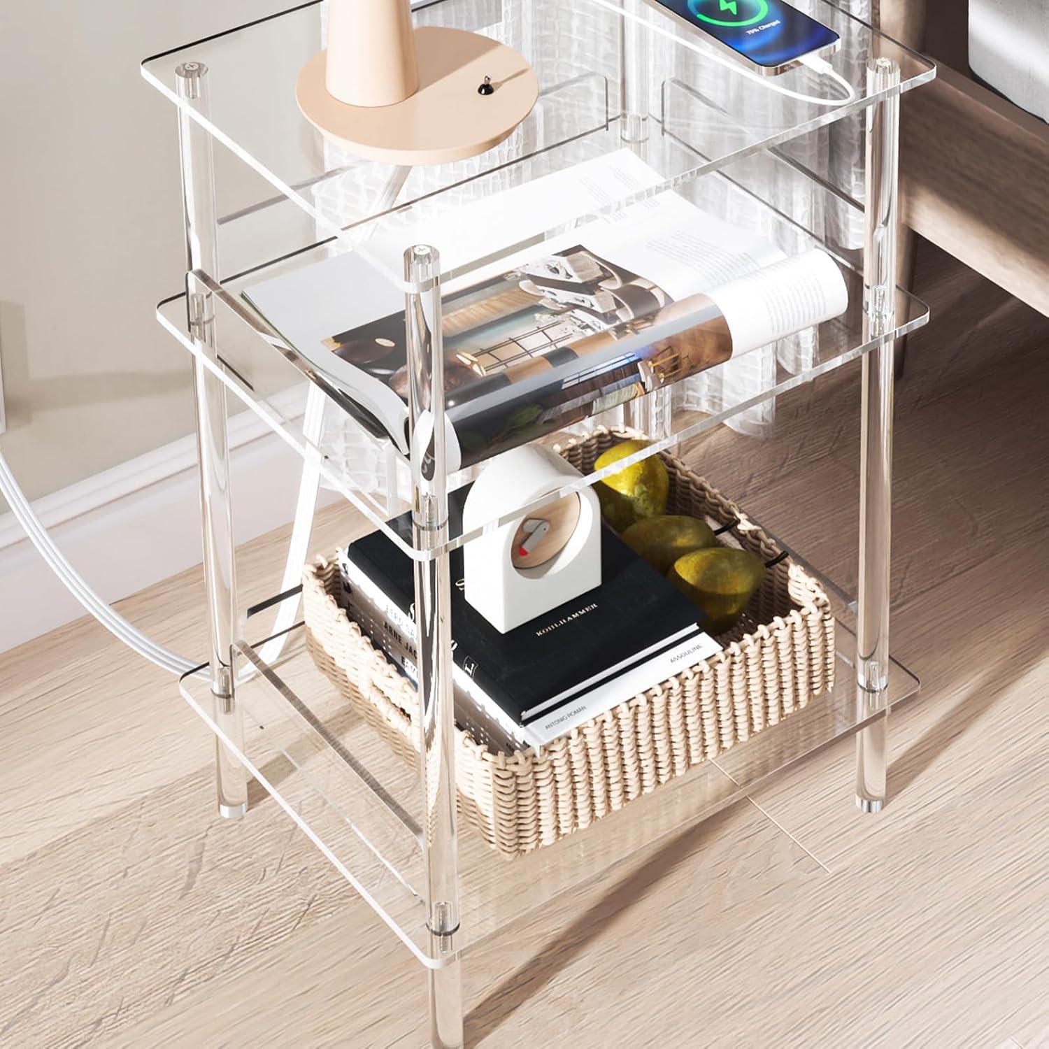 After spending considerable time with this acrylic charging nightstand, we appreciate its sleek, modern design paired with smart functionality. The built-in power outlets and USB ports make it incredibly convenient to charge multiple devices simultaneously without cluttering the space with extra cords. Thanks to its compact size and clear acrylic build, it complements small bedrooms or cozy corners without overwhelming the room visually. the three-tier storage adds useful organization options, and the raised edges provide peace of mind by securely keeping items like phones, glasses, or books from slipping off during the night.