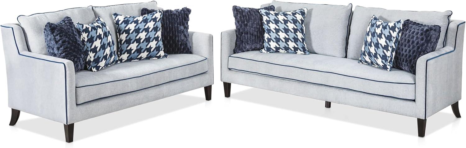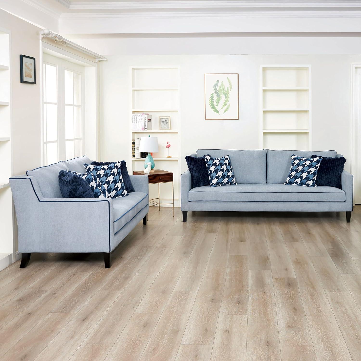 From the moment we unboxed this set, the transitional design promptly caught our eye. The scooped rolled arms paired with the tapered front legs and saber-shaped back legs give it a refined yet approachable look that works beautifully in both modern and classic settings. The rich blue upholstery stands out without overwhelming the room, while the solid kiln-dried wooden frames promise durability beneath that elegant exterior. the inclusion of patterned pillows adds a subtle burst of personality,breaking the monotony and complementing the rich fabric beautifully.