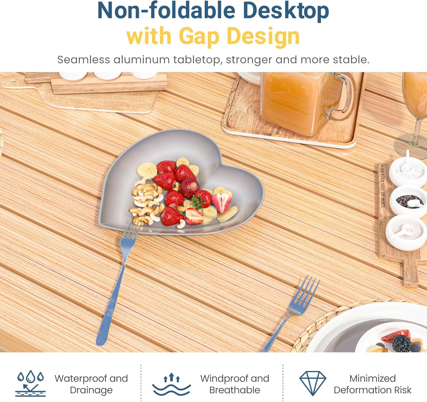 Careful around sharp edges. Ensure the furniture is stable and not overloaded to prevent tip-overs. In everyday use the set behaves like a lightweight, all-aluminum grouping: chairs and table are easy to shift across a patio or lawn, and the fixed tabletop sits with little flex under normal loads. The metal frame’s resistance to obvious weathering is apparent after brief outdoor exposure,and the hand-brushed finish hides small scuffs better than a glossy coat.At the same time, that same lightness means a gusty day can move or nudge pieces that aren’t anchored, and the fixed, non-folding tabletop makes the set less convenient when storage or tight transport is required.